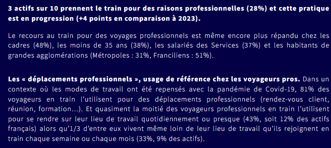 Quasiment la moitié des voyageurs professionnels en train l’utilisent pour se rendre sur leur lieu de travail quotidiennement ou presque (43%, soit 12% des actifs français) alors qu’1/3 d’entre eux vivent même loin de leur lieu de travail qu’ils rejoignent en train chaque semaine ou chaque mois. Source sondage Odoxa